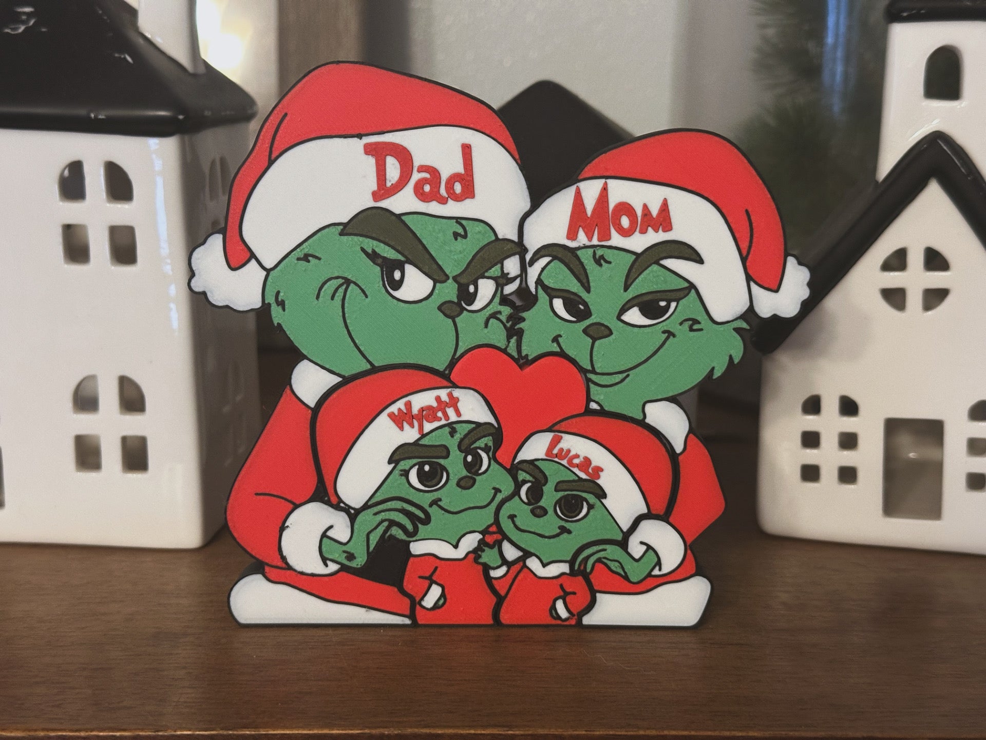 Celebrate this Christmas with this adorable handcrafted Grinch family puzzle, made from durable, high-quality polymer. Featuring a smooth finish, the puzzle includes interlocking Grinch, each personalised with names — perfect for parents and a child. A red heart accent adds a loving touch.